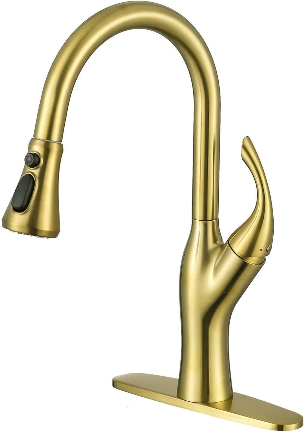 🛒 Crazy Deals Brushed Gold Pull Down Kitchen Sink Faucet with Single Handle High Arc Brass Kitchen Sink Faucet with Pull Out Sprayer, Single Hole and 3 Hole Deck Mount with Deck Plate
