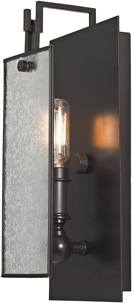 ELK Lyndhurst 1 Light Sconce In Oil Rubbed Bronze The Lyndhurst collection reveals a light, airy design augmented with mercury glass panels elegantly suspended from custom designed hooks. The slender lines are highlighted by the Oil Rubbed Bronze finish which, with its neutral attributes, can coordinate with a wide range of decors. Collection: Lyndhurst Item Type: Sconce Finish: Oil Rubbed Bronze Height: 13Width: 4Length: 4Ext: 4Weight: 3Ships: UPS or Fedex.